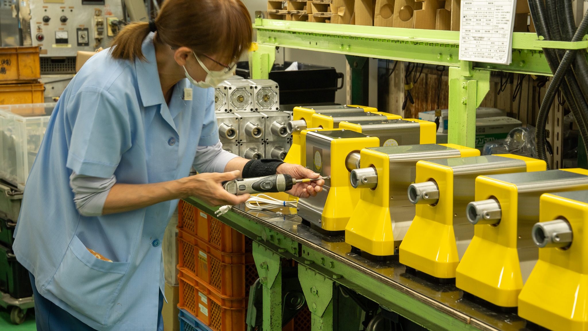 ベースプラケットにブリッジダイオードやノズルフィルターを取り付け、リアフレームにはトグルスイッチなどの電装部品を組み付けます。さらに、駆動部にはギヤーを組み立て、各部品の取り付けにはトルクチェッカーを使用して適正トルクで管理を行い、作業の精度と信頼性を確保しています