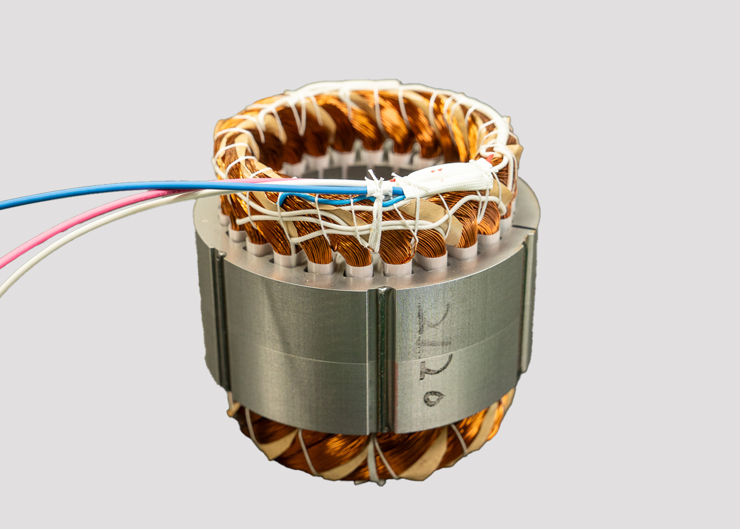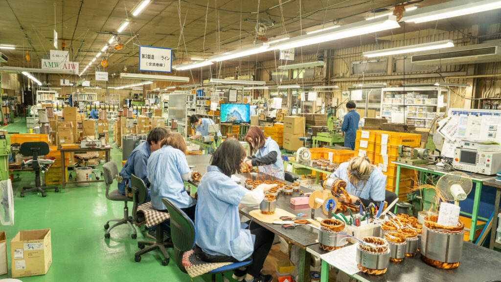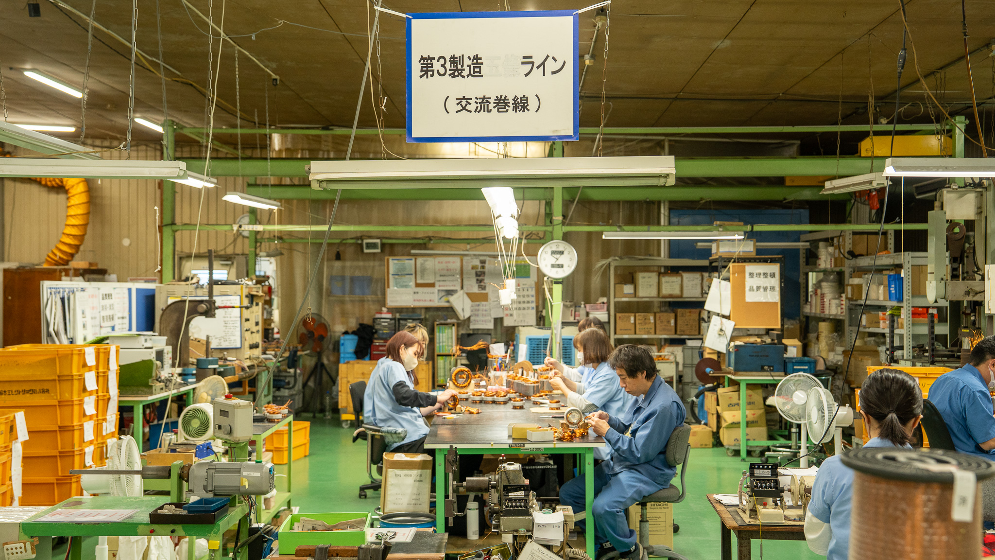 コイル挿入後の成型、絶縁紙の挿入、レーシング、リード線の取り付けまで、すべての工程を1台ずつ丁寧に手作業で行っております。